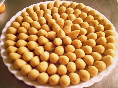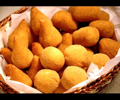 Salgados Fritos: Bolinhas de queijo, calabresa, bolinho de aipim com carne, carne seca ou queijo, bolinho de bacalhau, coxinha de frango, croquete de carne, de azeitona, queijo com presunto, empafas, empanado de camarão, risoles, quibes, etc.